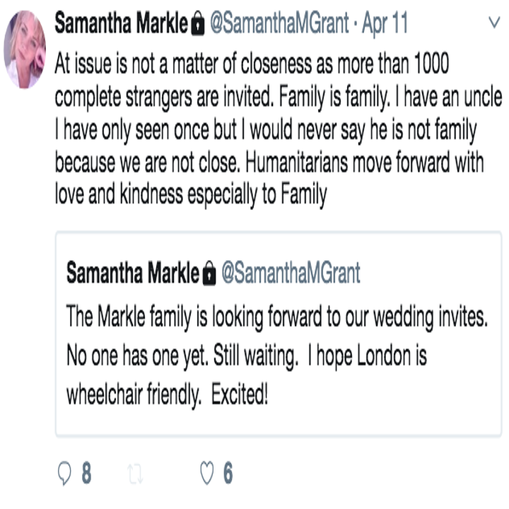 Grant, who lives in Florida, has been blasting her half-sister to the press and on Twitter ever since news broke of Markle's relationship with Prince Harry, giving interviews to UK media outlets that paint Markle as a shallow social climber. She claims to soon be releasing a book called "The Diary of Princess Pushy’s Sister" that will include never-before-seen pictures and tales from Markle's childhood. She recently went on a Twitter rant about not being invited to the royal wedding.